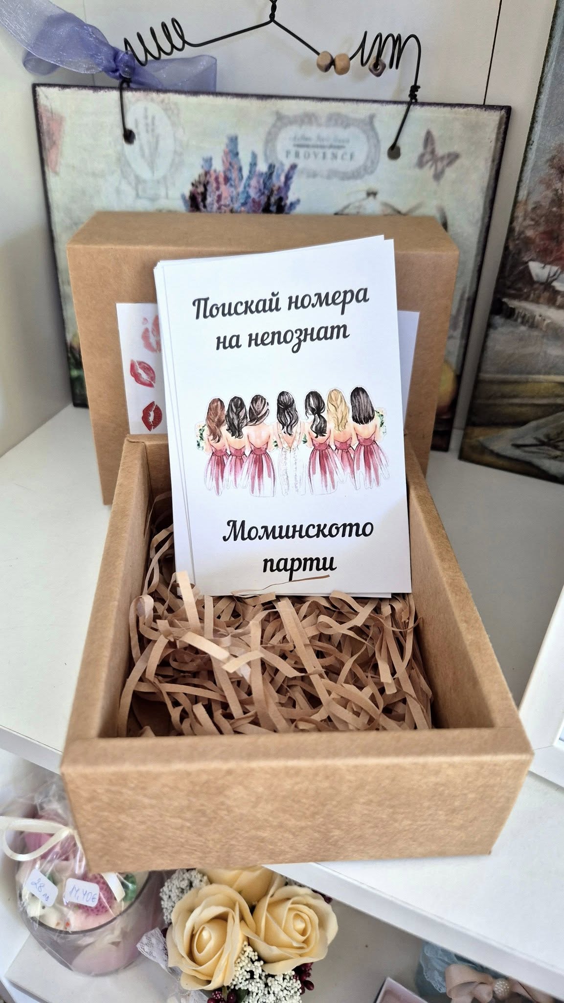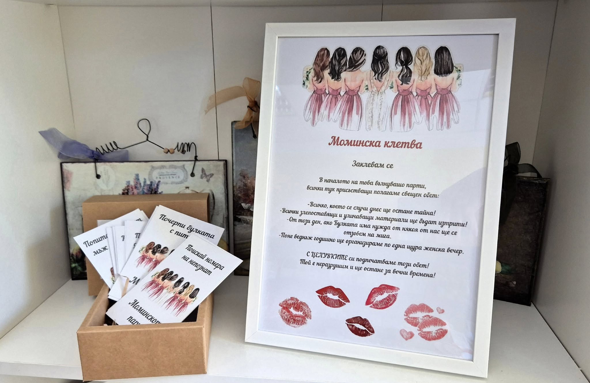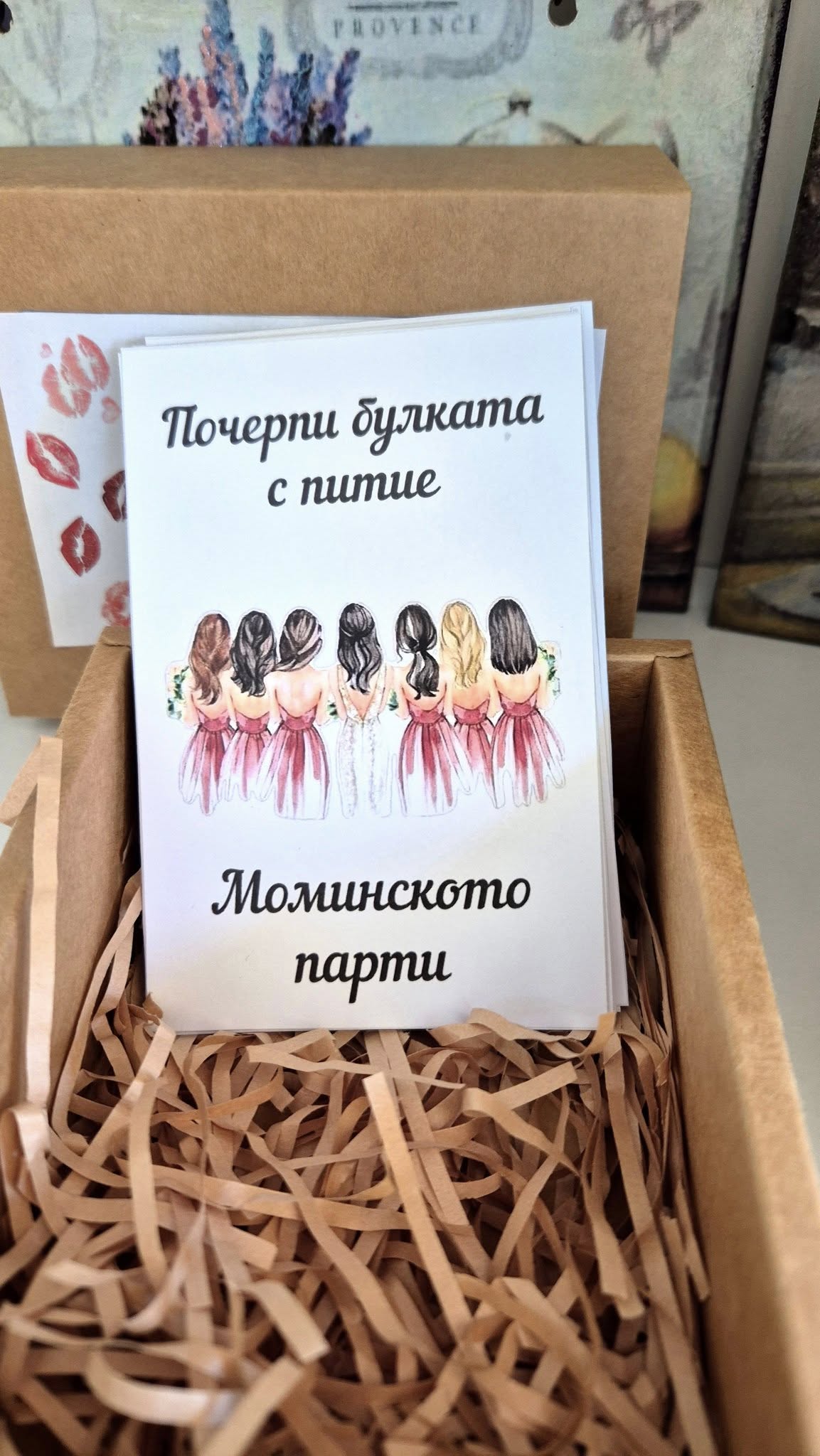 Картичката-покана на изображението е аксесоар, който обикновено се нарича „Покана за моминско парти“.