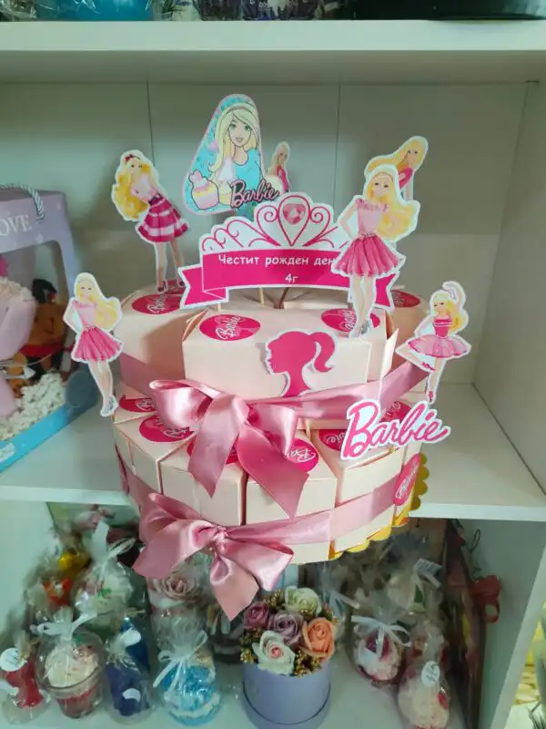 Детска ръчно изработена картонена торта, подходяща за всеки рожден ден и за внасяне в детската градина. Състои се от сглобени картонени празни парчета, поставка и табелка с декорация – име,години и друг вид декорация.