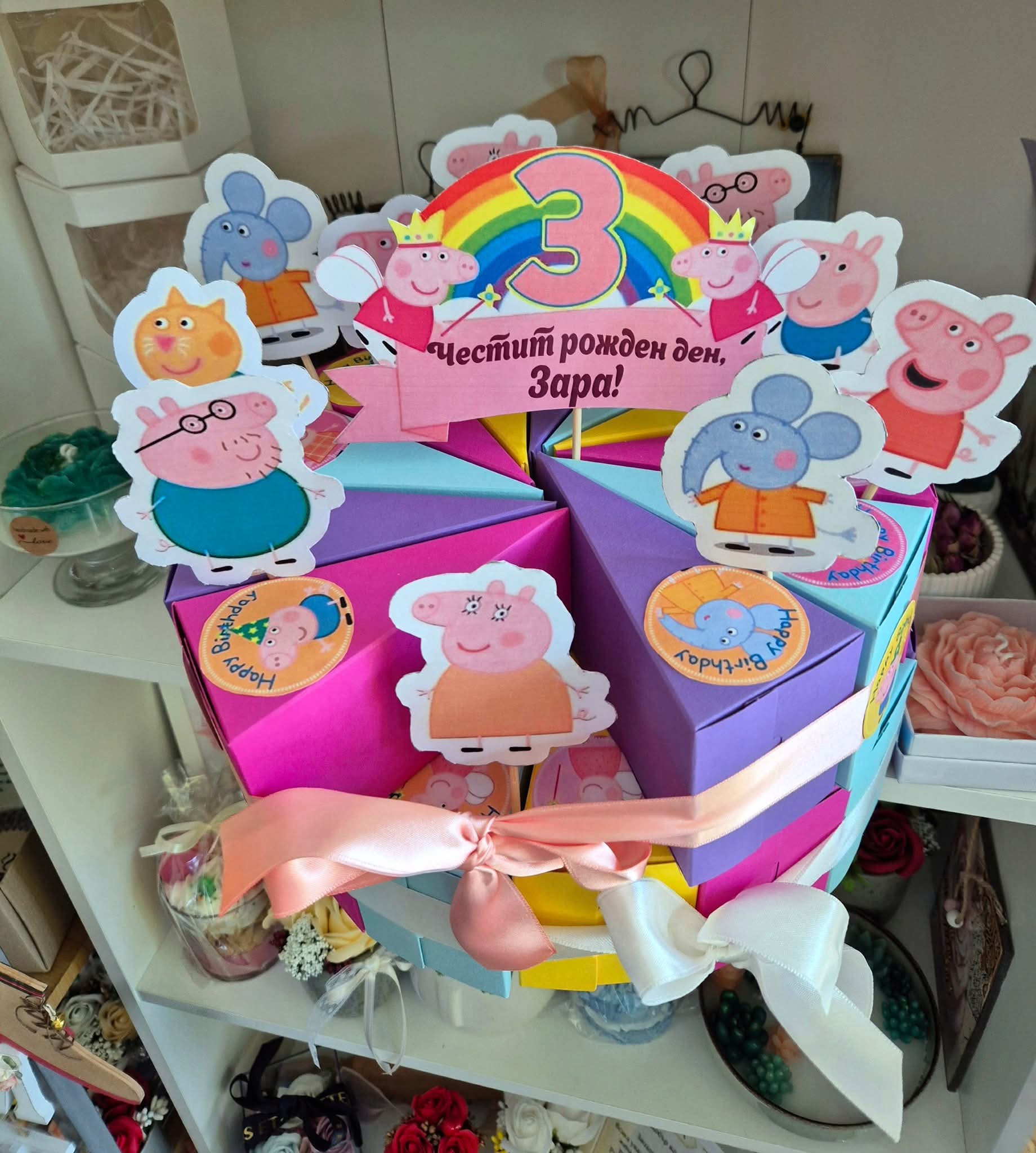 Детска ръчно изработена картонена торта, подходяща за всеки рожден ден и за внасяне в детската градина. Състои се от сглобени картонени празни парчета, поставка и табелка с декорация – име,години и друг вид декорация.