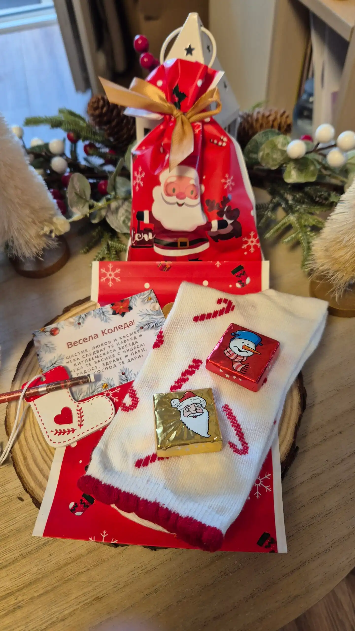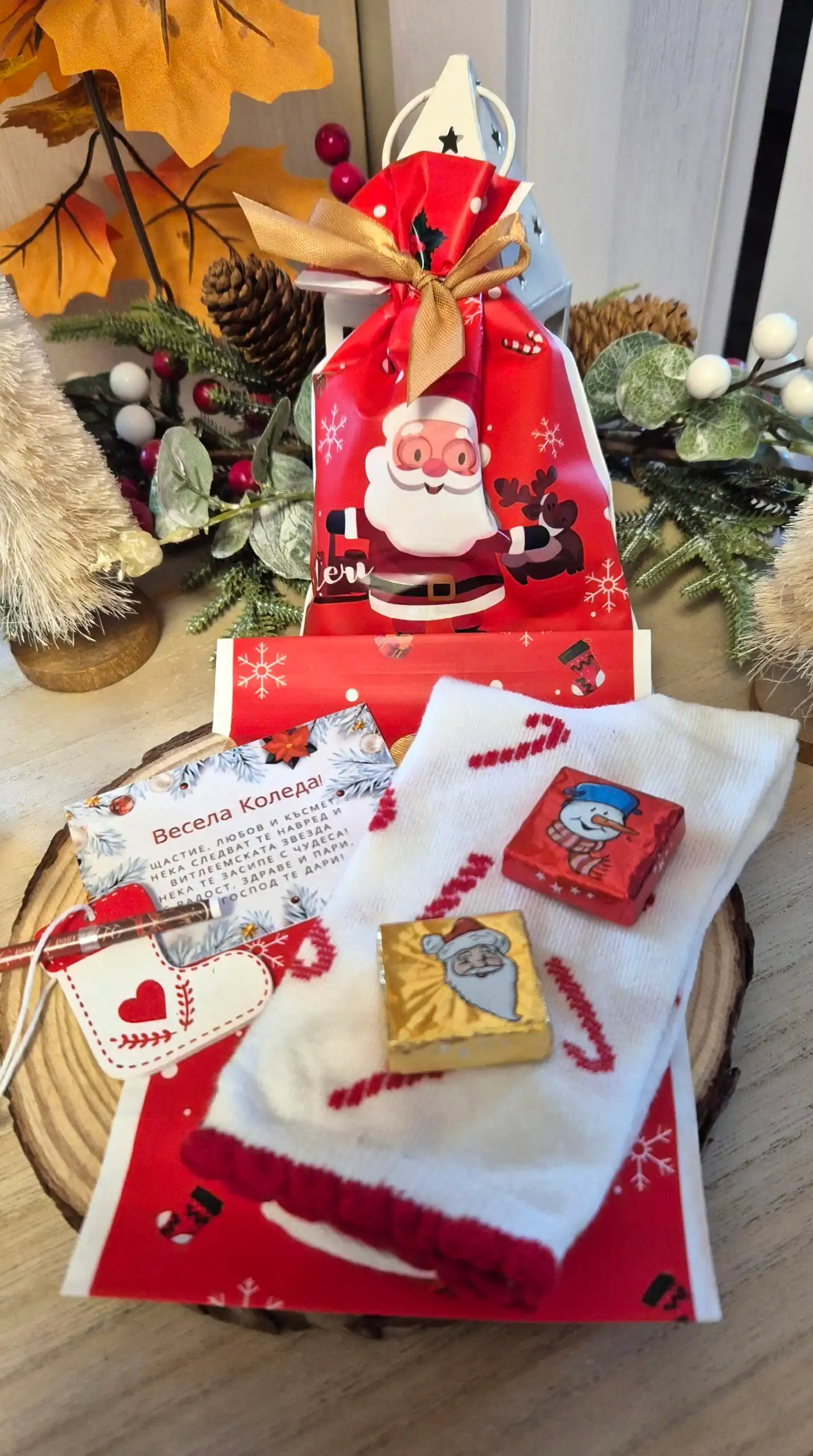 Съдържа : Коледен Чифт чорапи,лакомства, играчка за елха с късмет и Коледна картичка с пожелание с възможност за надпис в задната част. Добра възможност за поставяне и на пари за Коледа и сурвакане. Подходящ подарък както за деца, така и за колеги, близки, семейство, съученици. Бюджетен и компактен подарък за предстоящите празници.