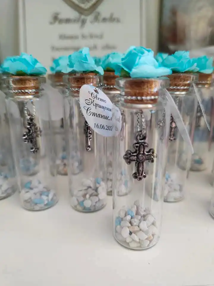 Подарете на своите гости частица от магията и светостта на този специален ден! Нашите ръчно изработени стъклени шишенца са символ на чистота, вяра и благодарност. Съчетанието от нежна тюркоазена (или сребриста) роза и детайлно изработено метално кръстче превръща този сувенир в незабравим спомен от първия голям празник на вашето дете.