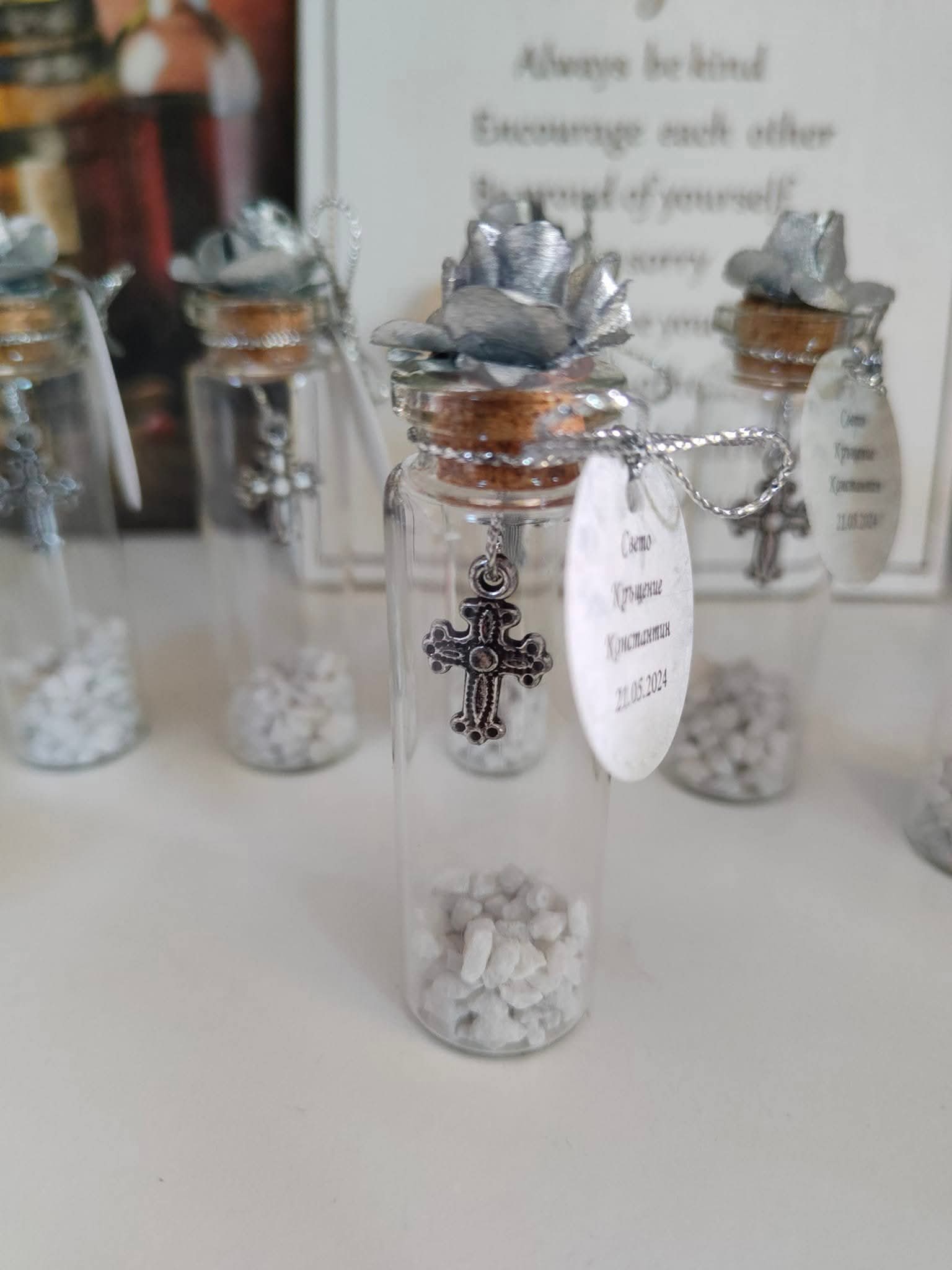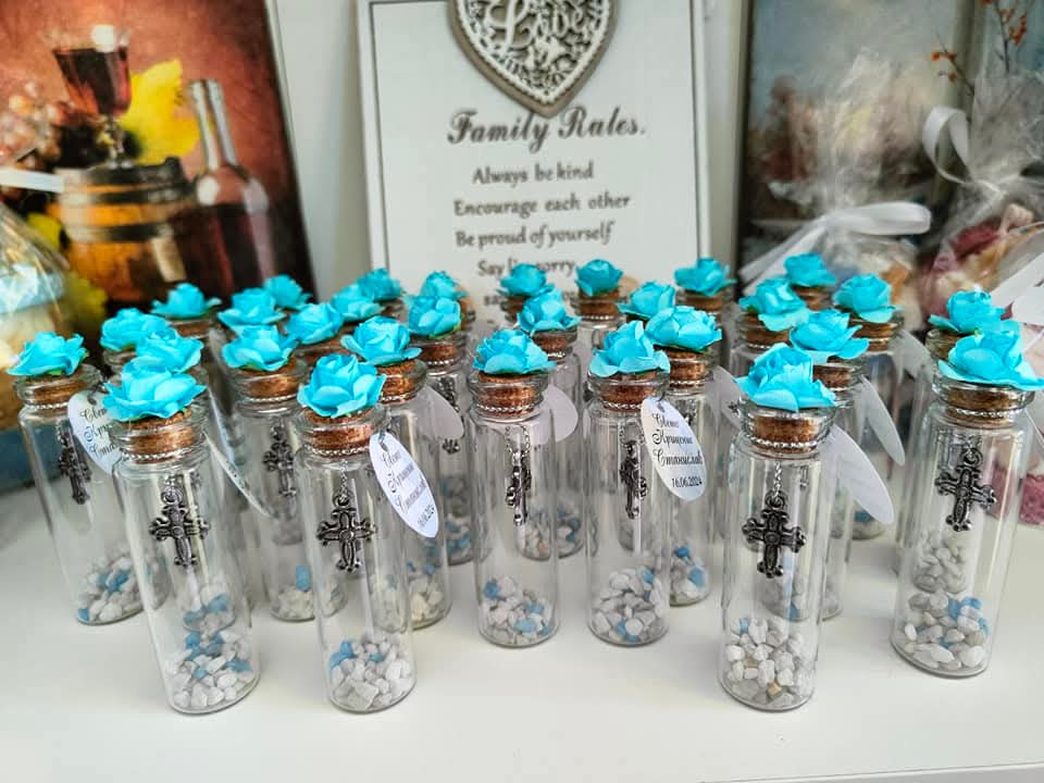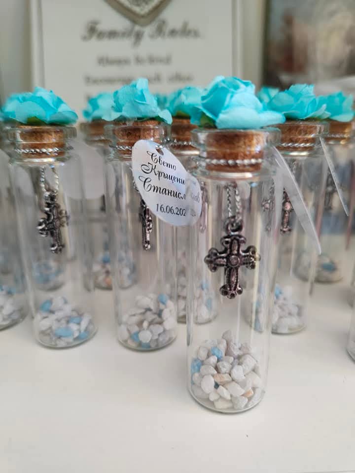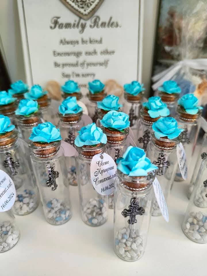Подарете на своите гости частица от магията и светостта на този специален ден! Нашите ръчно изработени стъклени шишенца са символ на чистота, вяра и благодарност. Съчетанието от нежна тюркоазена (или сребриста) роза и детайлно изработено метално кръстче превръща този сувенир в незабравим спомен от първия голям празник на вашето дете.