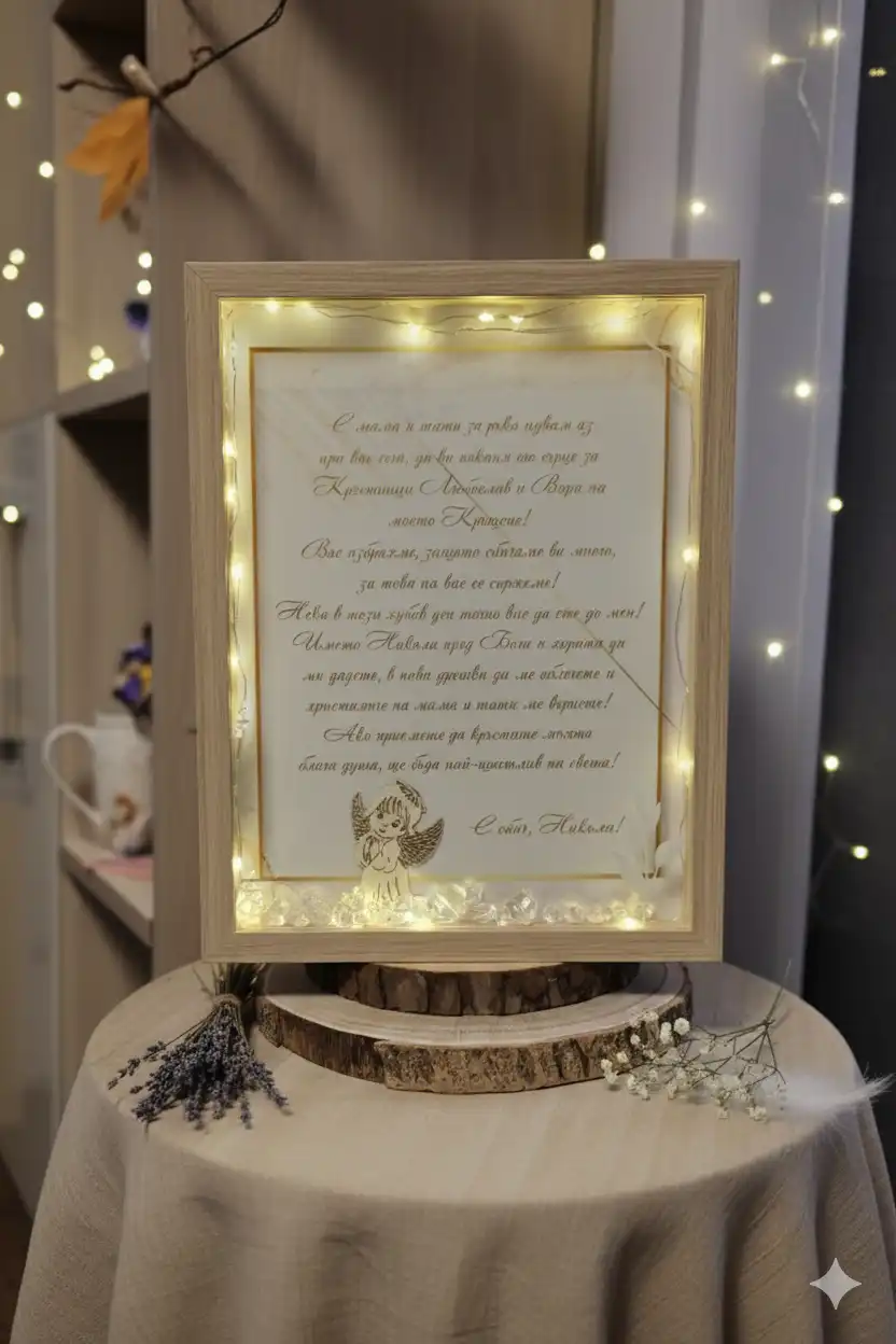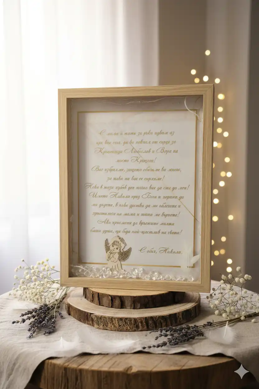 ​Кръщенето е един от най-светлите празници в живота на едно дете, а изборът на кръстници е избор на духовни родители. Тази уникална рамка с послание от малкия Никола е нашият начин да кажем: „Обичаме ви и искаме точно вие да сте до нас.“ 🤍