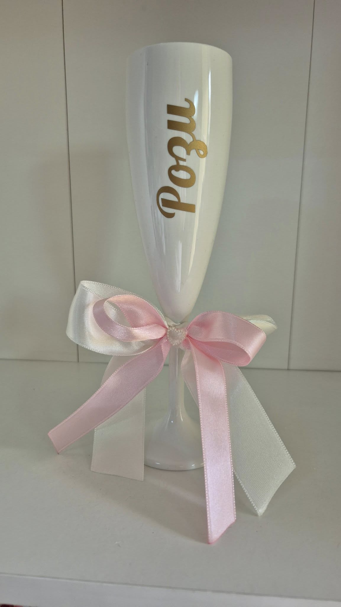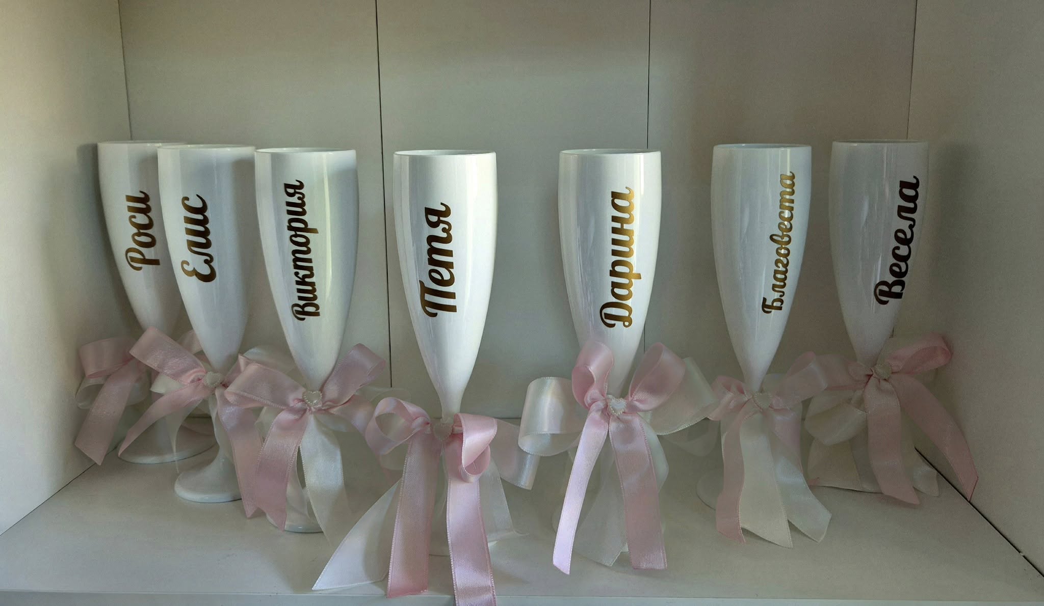 - Персонализация: Всяка чаша може да бъде персонализирана с име или титла („Булка“, „Кума“, „Шаферка“) в цвят по ваш избор.