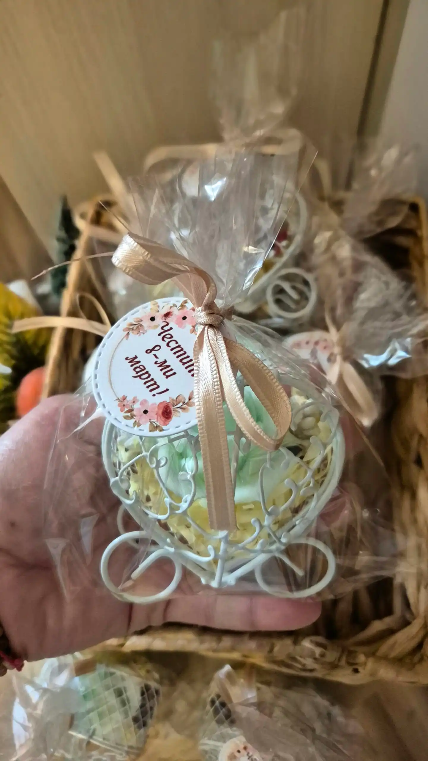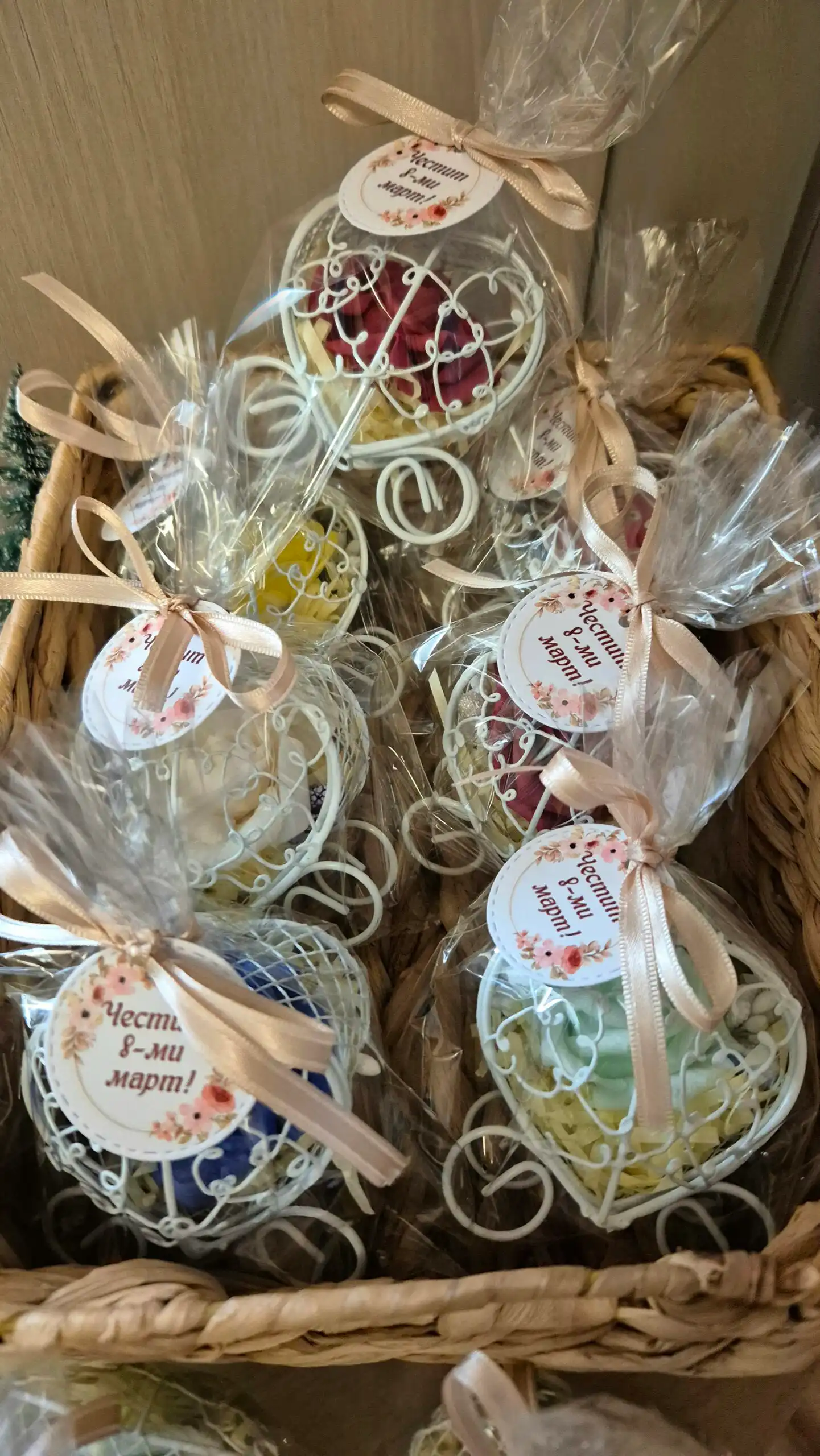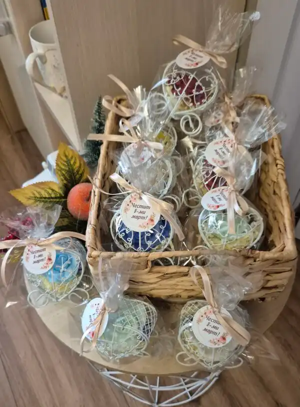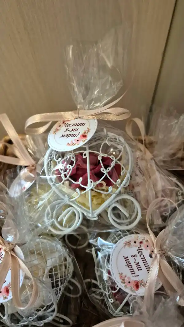 Продуктът пристига готов за подаряване – в целофанова опаковка с луксозна сатенена панделка и персонализиран етикет „Честит 8-ми март“.