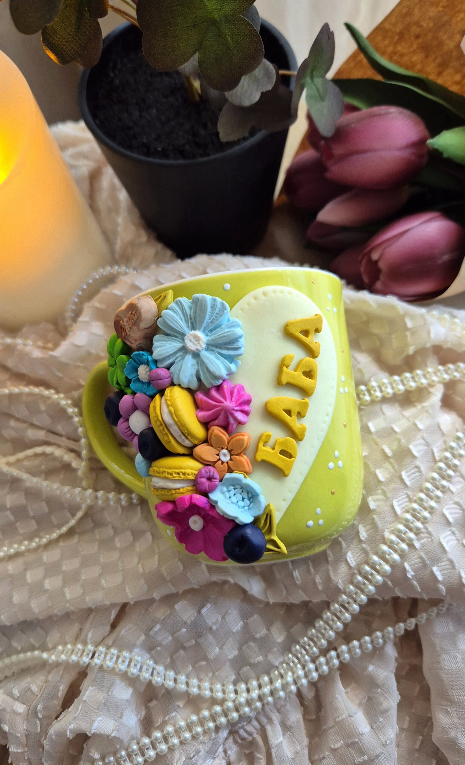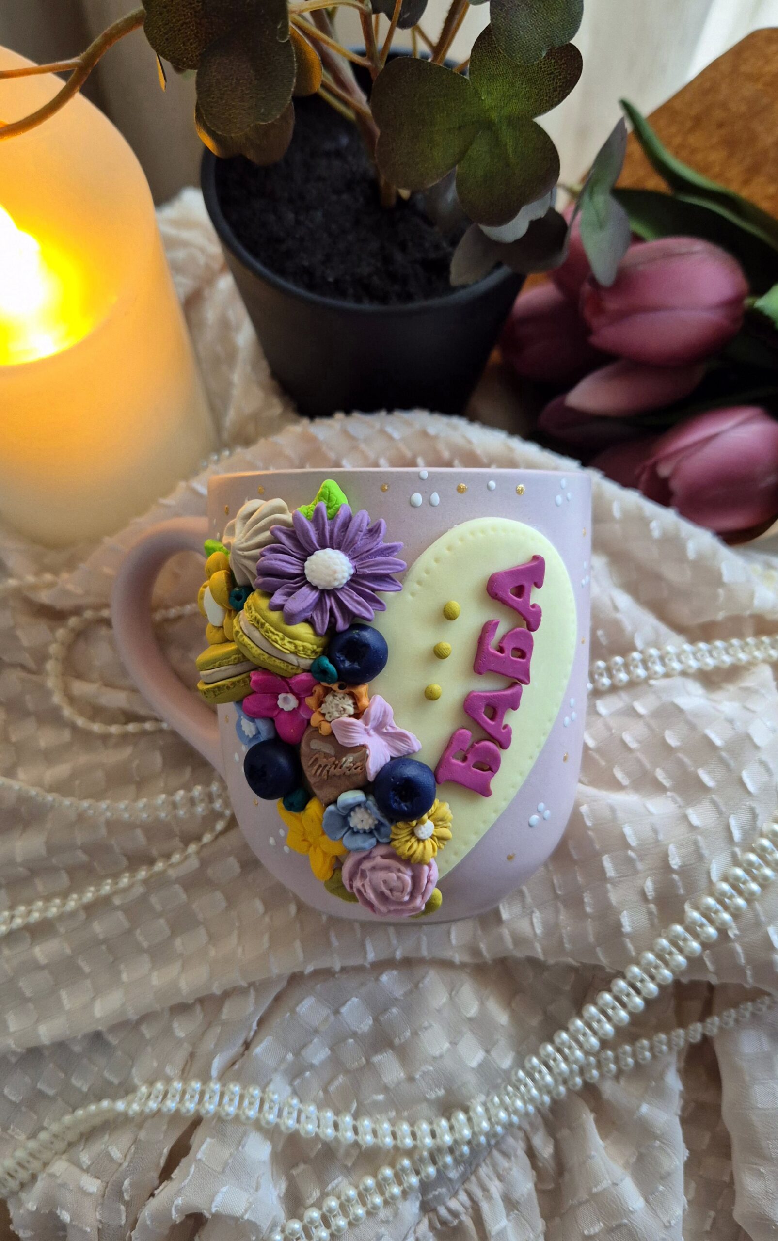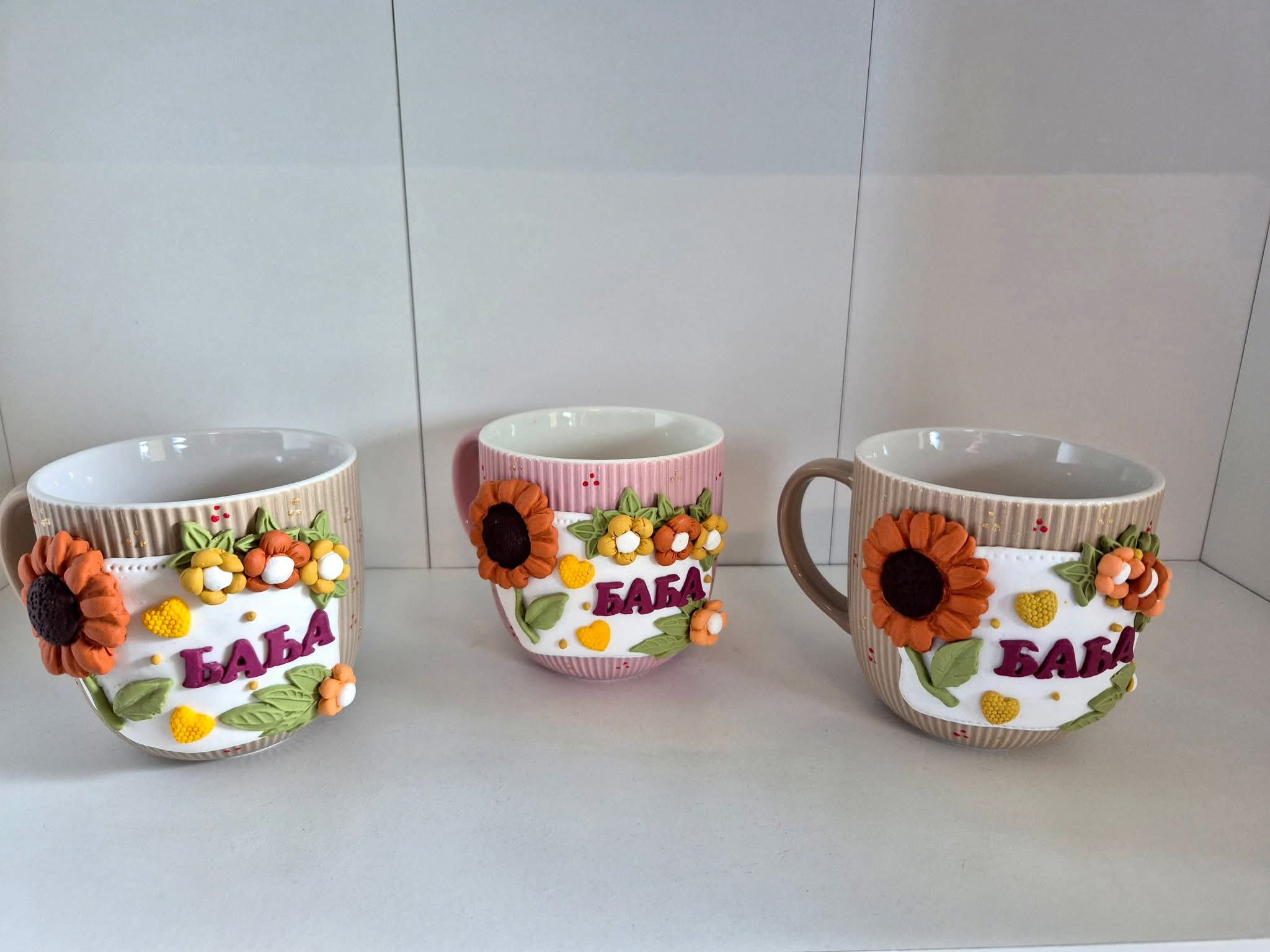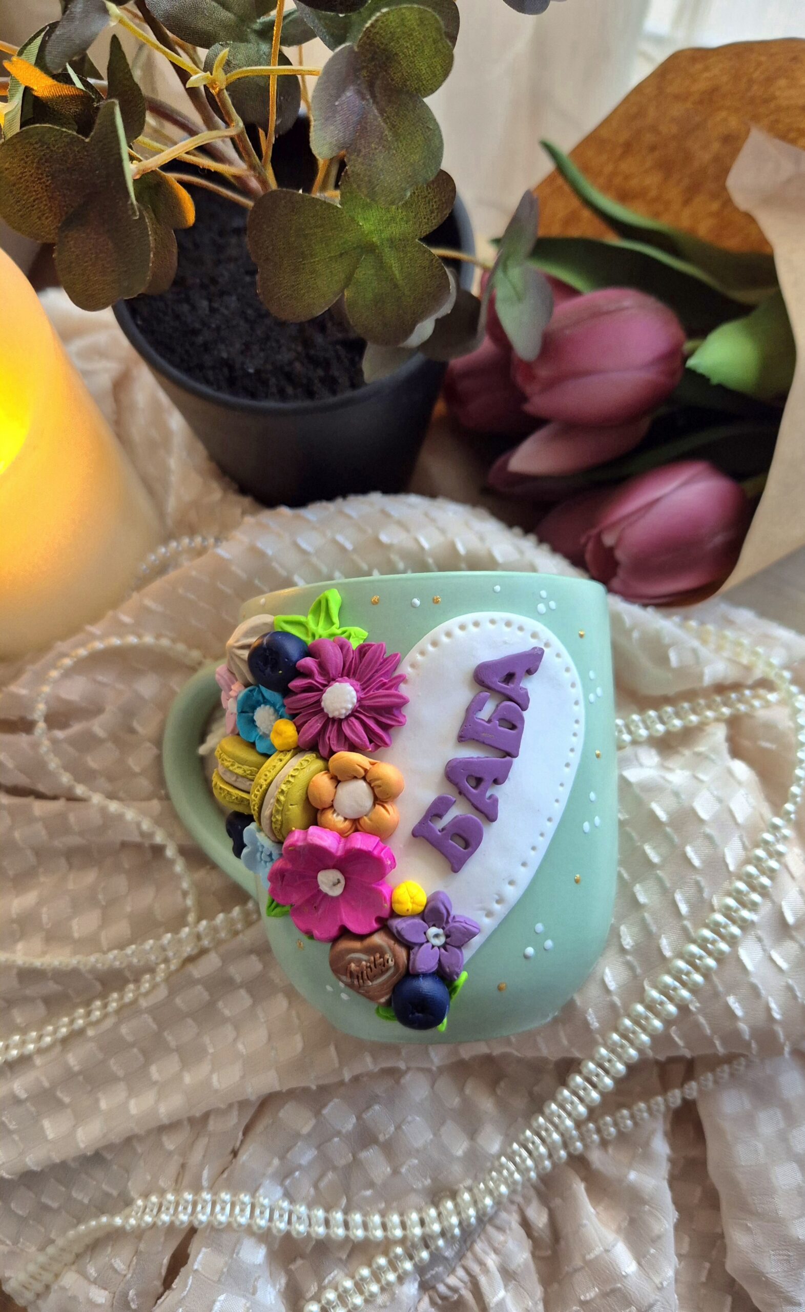 Всяка чаша е уникално произведение на изкуството, украсено с детайлни елементи от полимерна глина: нежни цветя, сочни боровинки и реалистични сладки макарони. Централното място заема сърце с надпис „БАБА“, напомняйки за най-топлата прегръдка на света.
