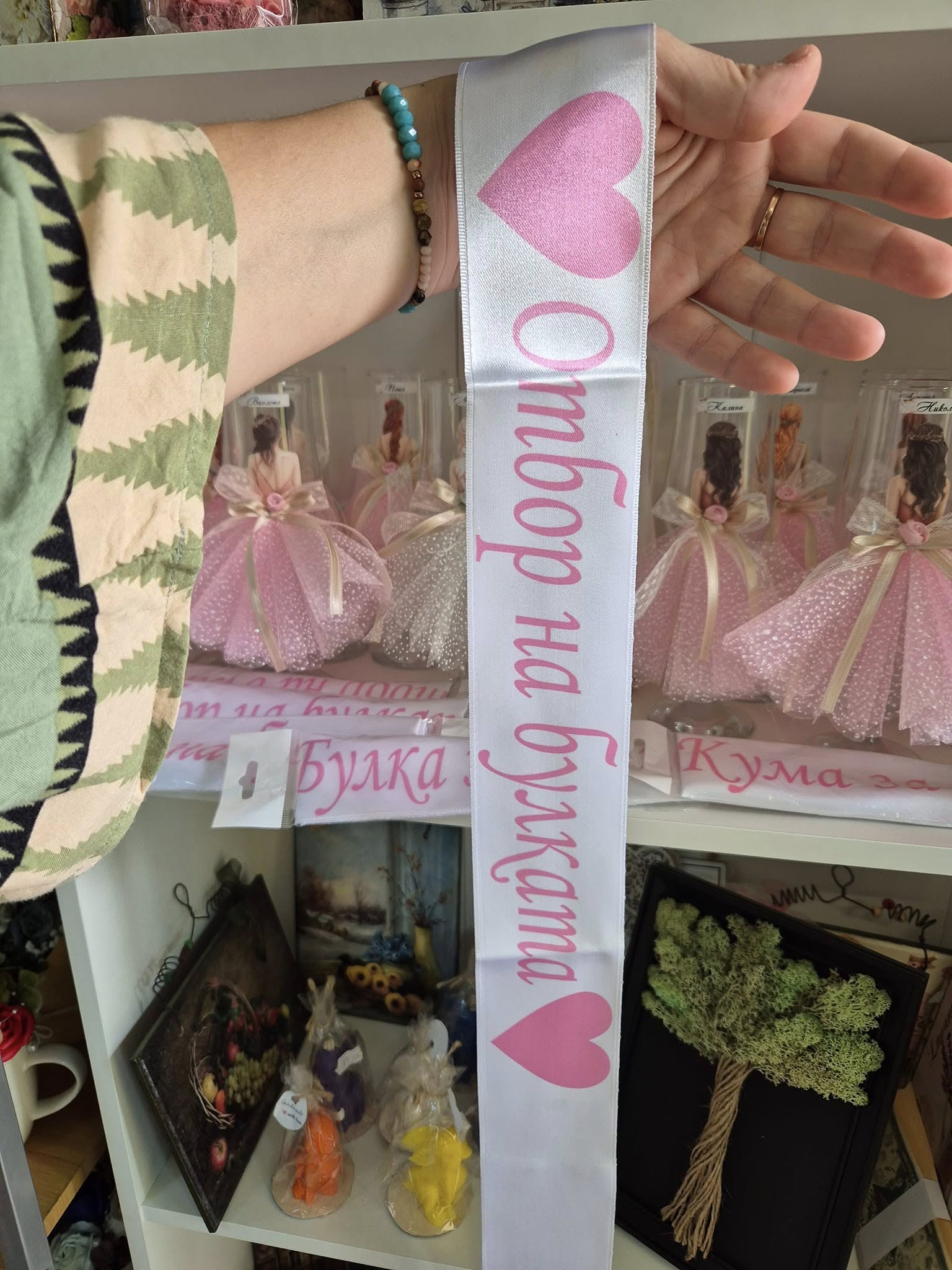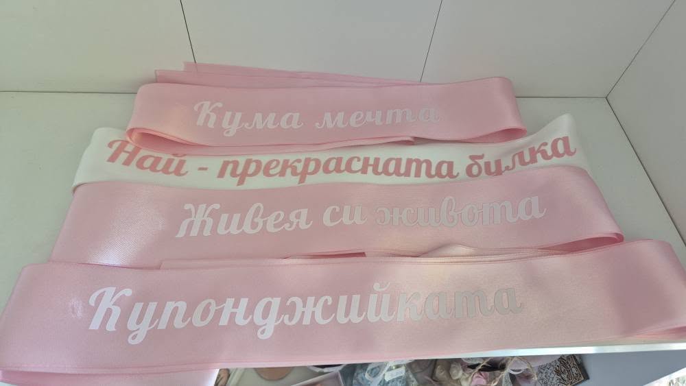 - Персонализация: Лентата може да бъде персонализирана с име или титла („Булка“, „Кума“, „Шаферка“) и дата, в цвят по ваш избор.