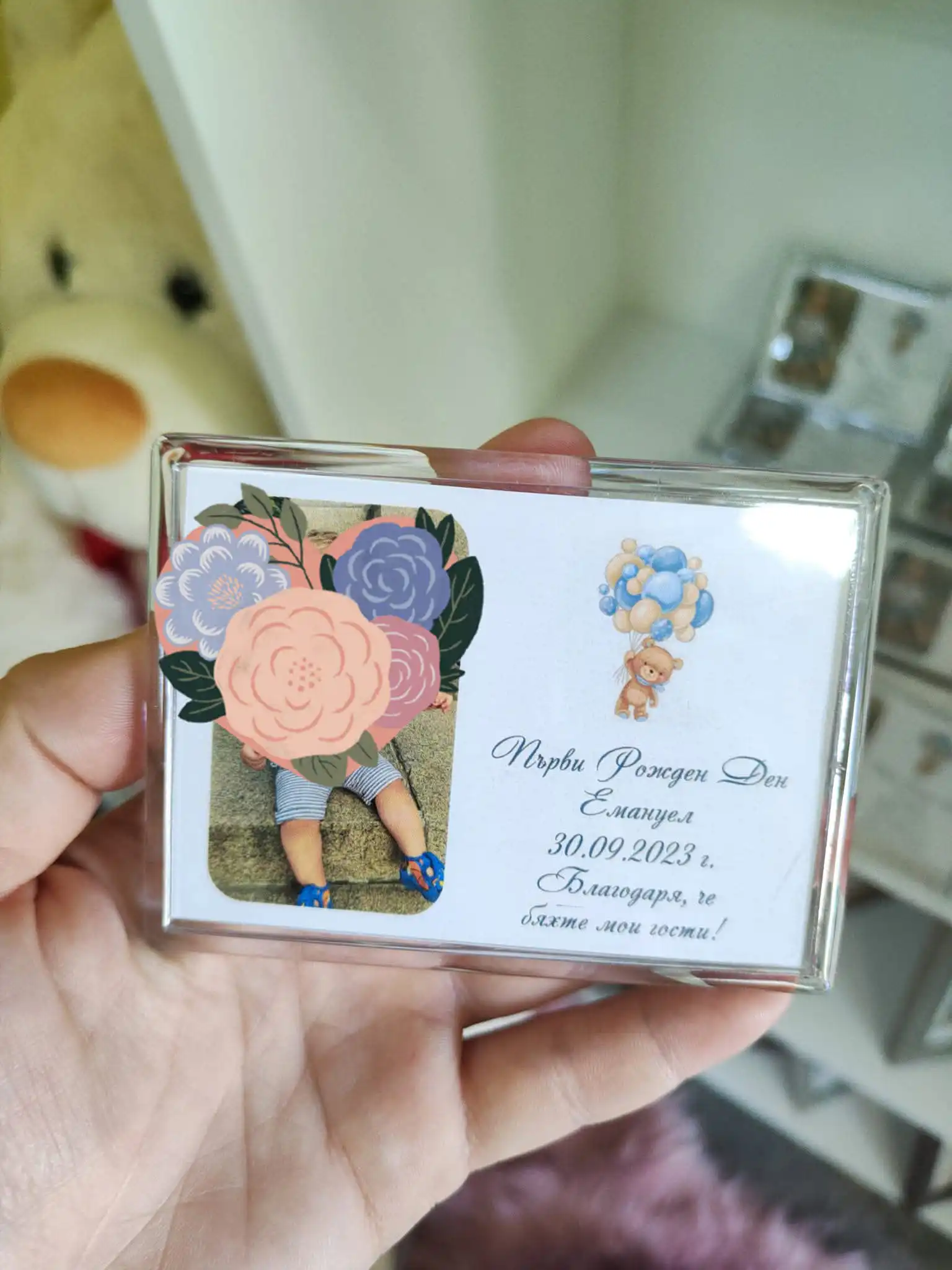 Висококачествен печат: Наситени цветове и възможност за поставяне на снимка на Вашето дете, име и дата на събитието.