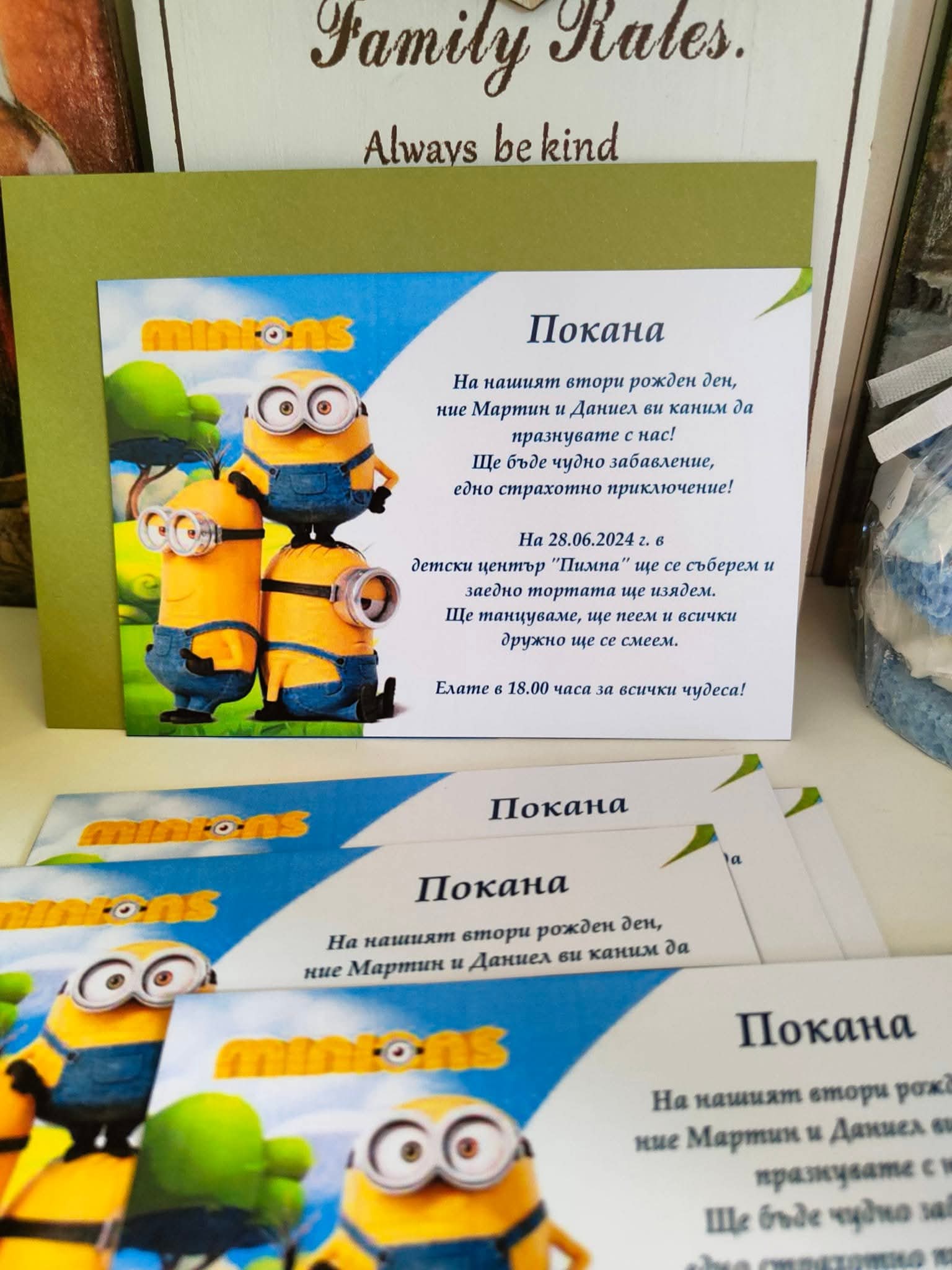 „Миньони, Мики Маус или Жирафчета? Кой е любимият герой на вашето дете? 🎂 Направете рождения му ден незабравим още с поканата! Пишете ни на лично съобщение за индивидуални поръчки.“