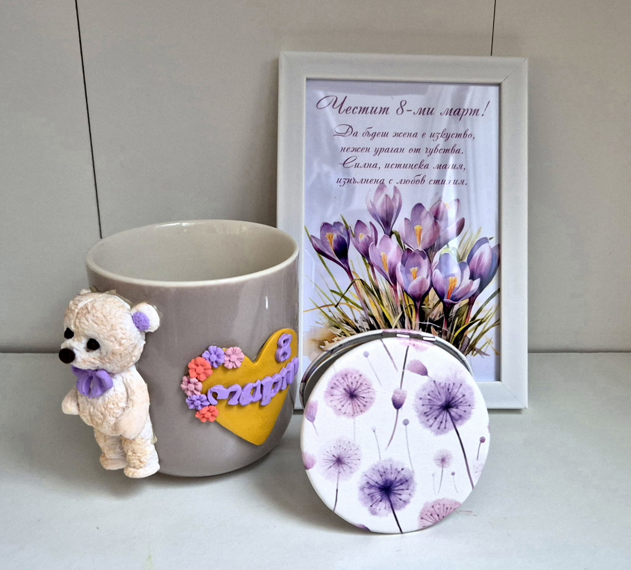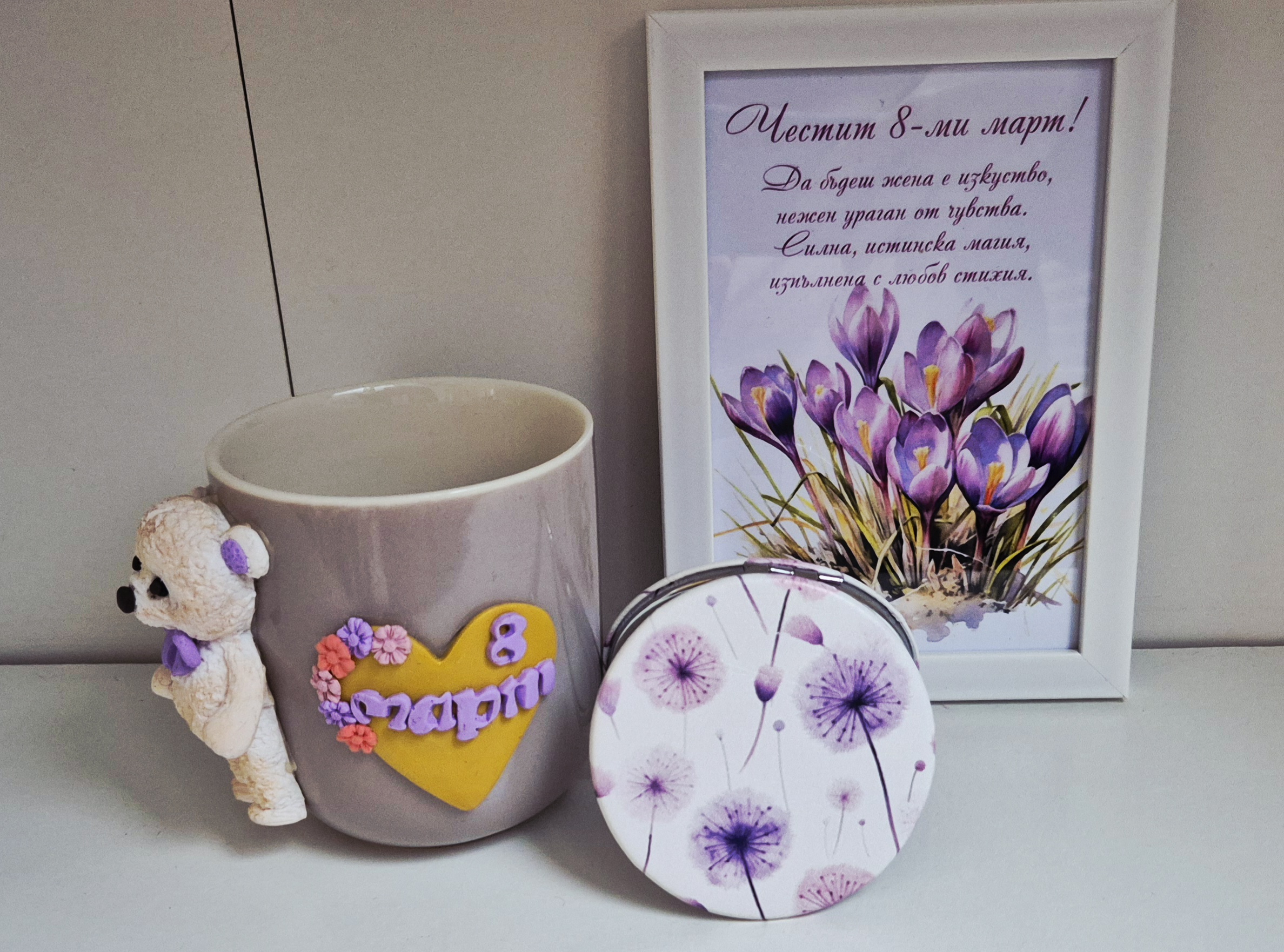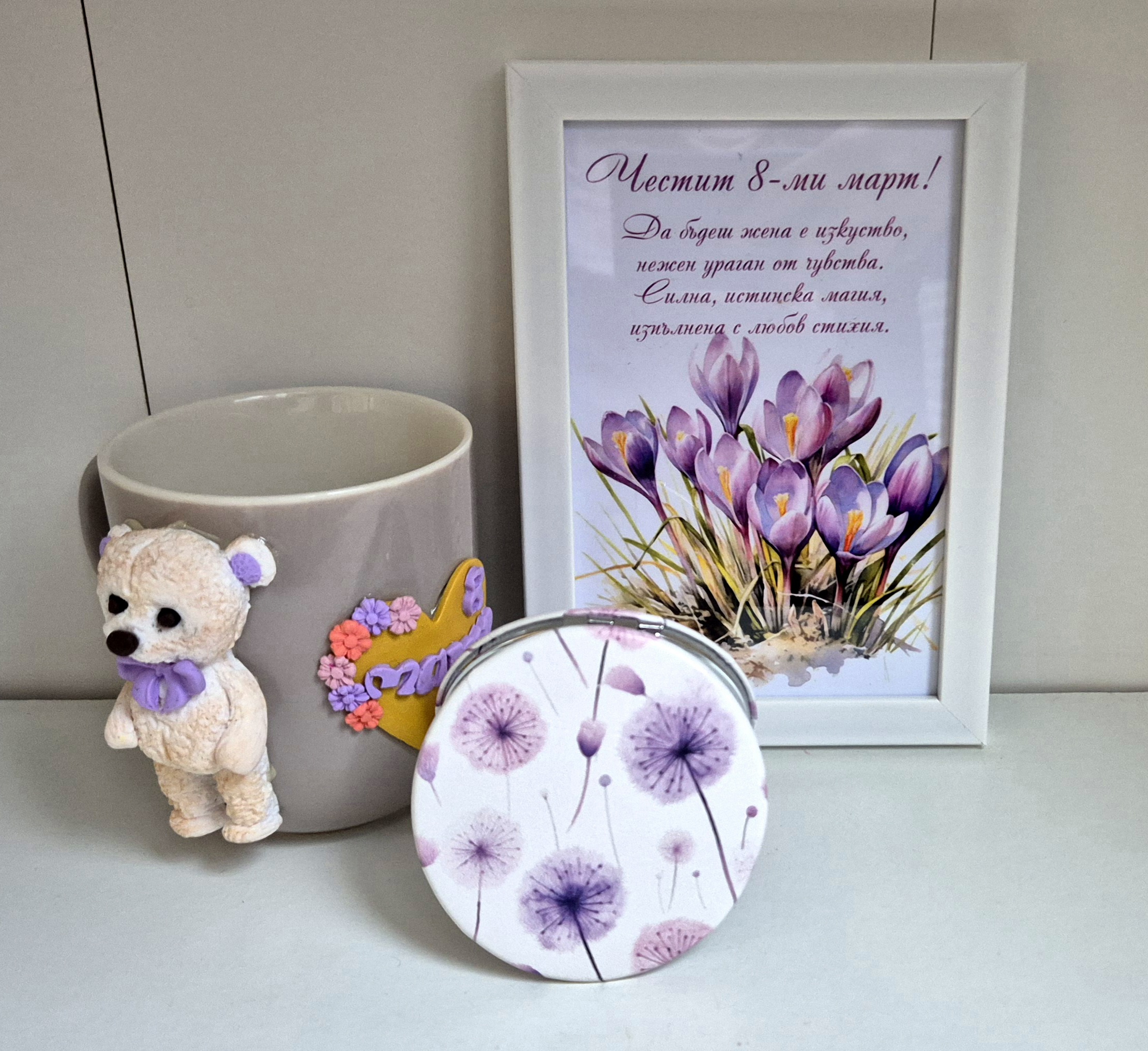 • Търсите перфектния подарък за 8-ми март? Изненадайте я с нашия нежен комплект: уникална 3D чаша, стилно огледалце и рамка с красиво пожелание. Поръчайте сега