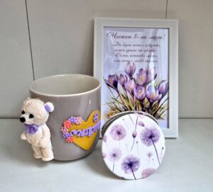 • ​ръчно изработена чаша с мече, чаша с полимерна глина, подарък за майка, нежен дамски комплект.